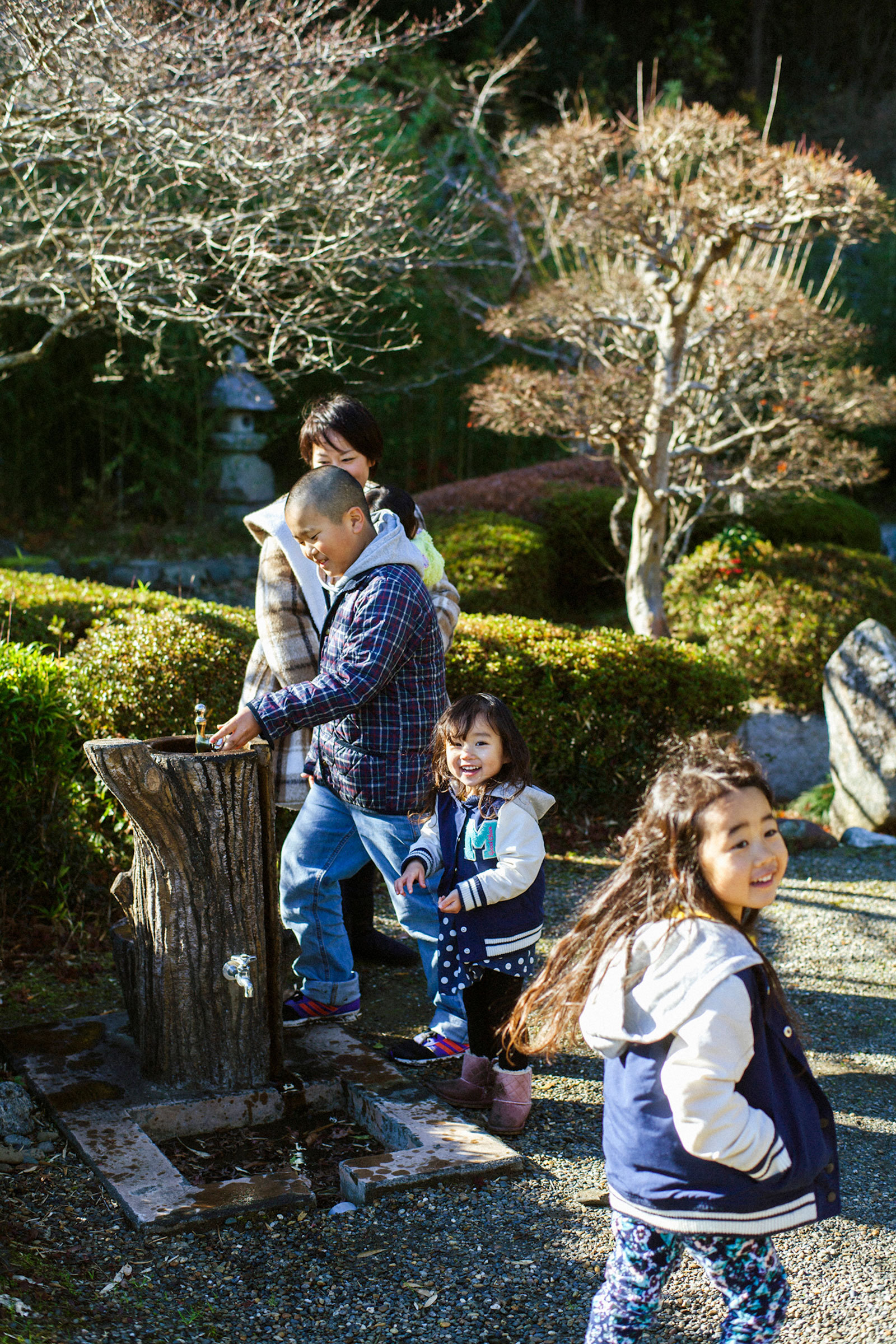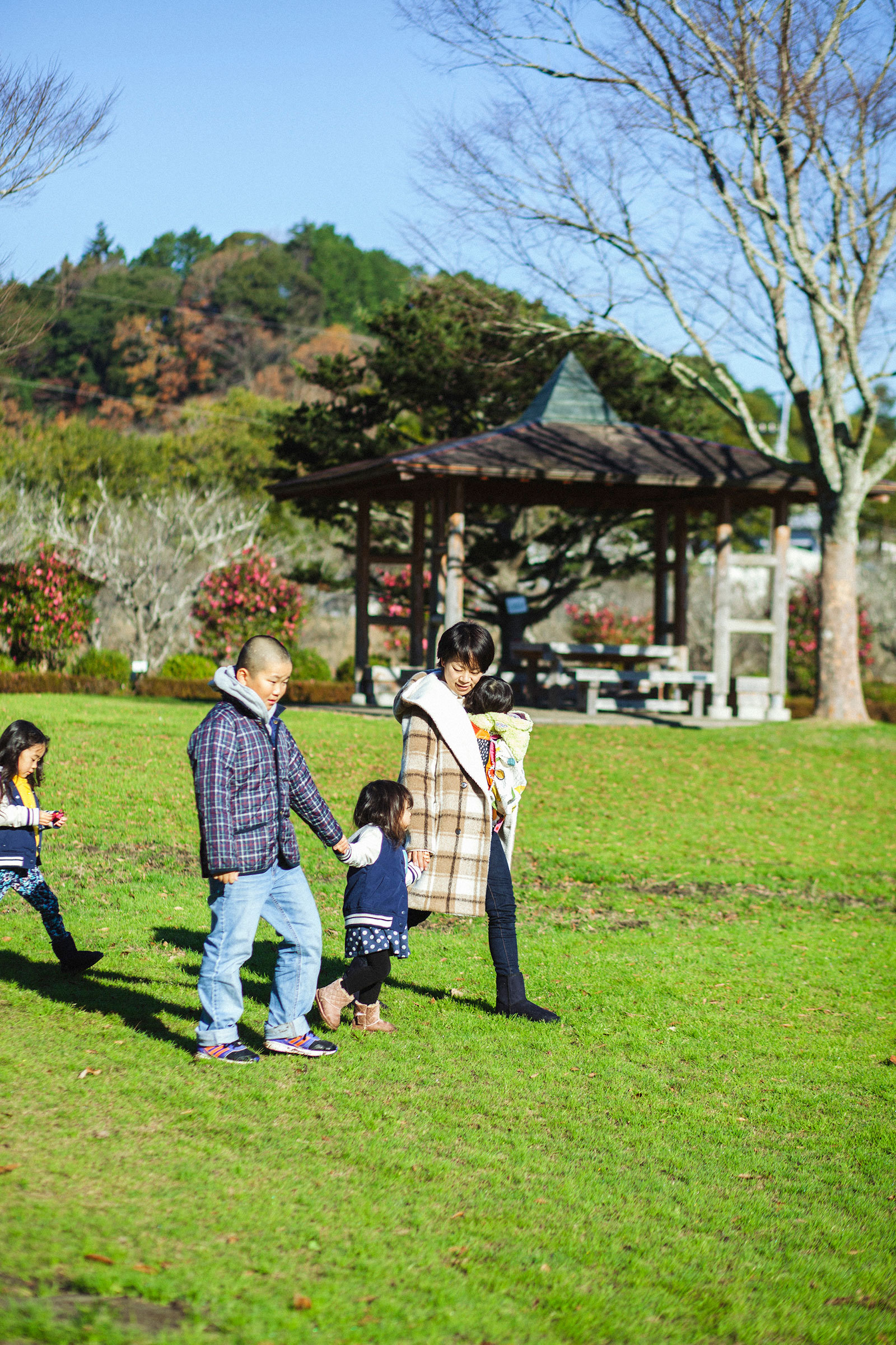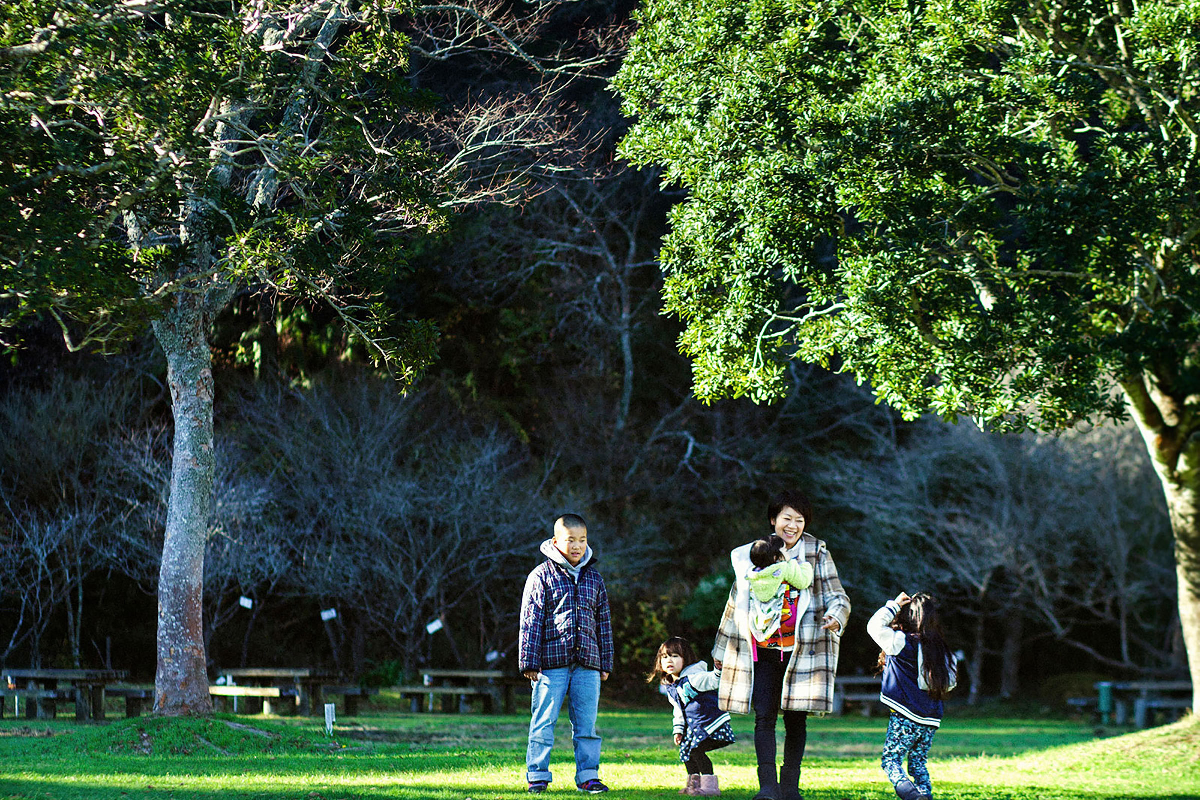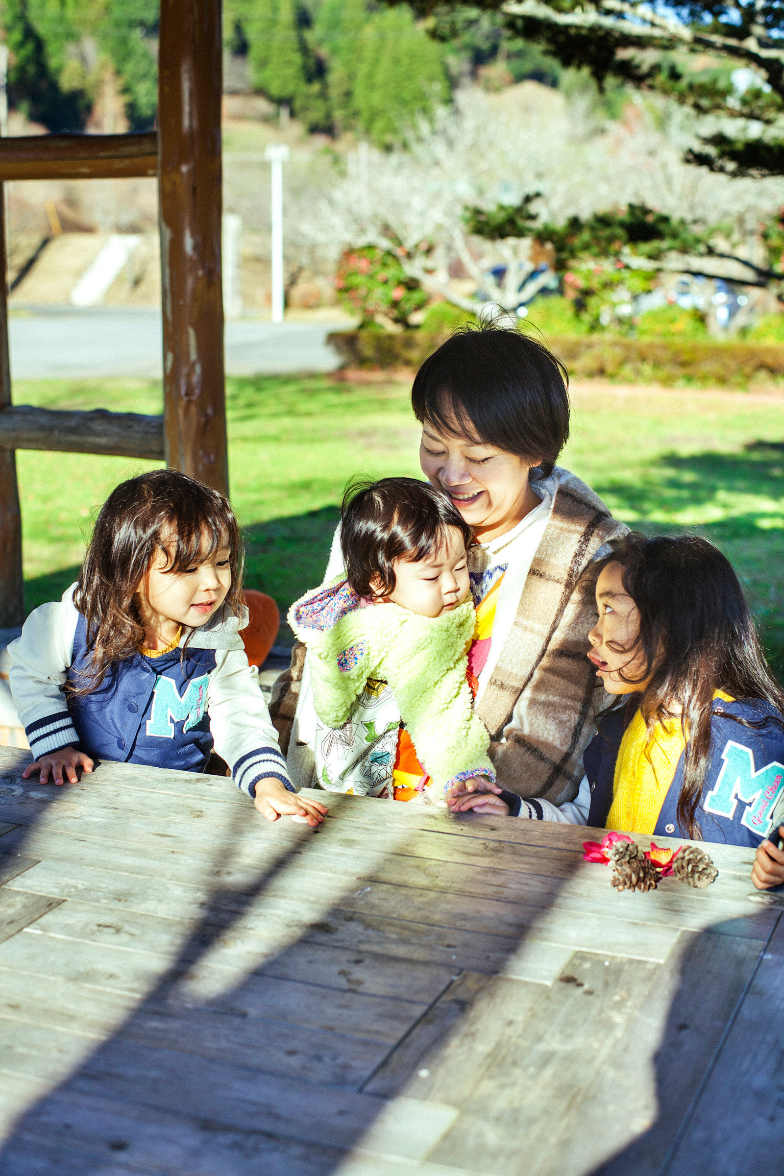 この日の撮影は「大多喜県民の森」。家族でよく遊びにくる場所だという。お兄ちゃんが妹たちの手を引き、お母さんが赤ちゃんを抱いて、4人並んで歩く。歩きながら落ちていた木の実を拾い、花を摘んで、それを見ながらおしゃべり。
