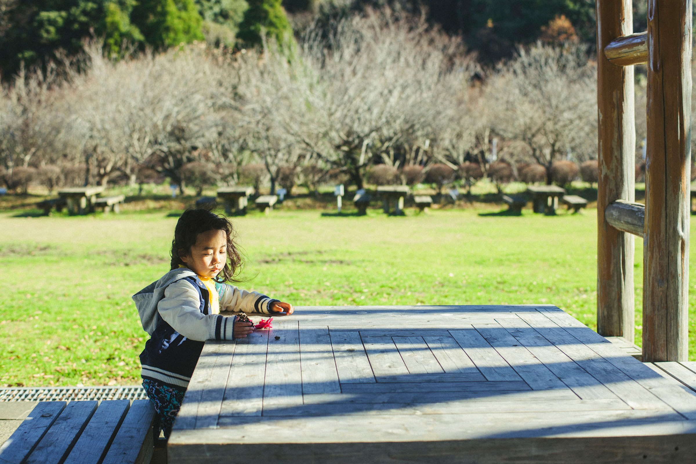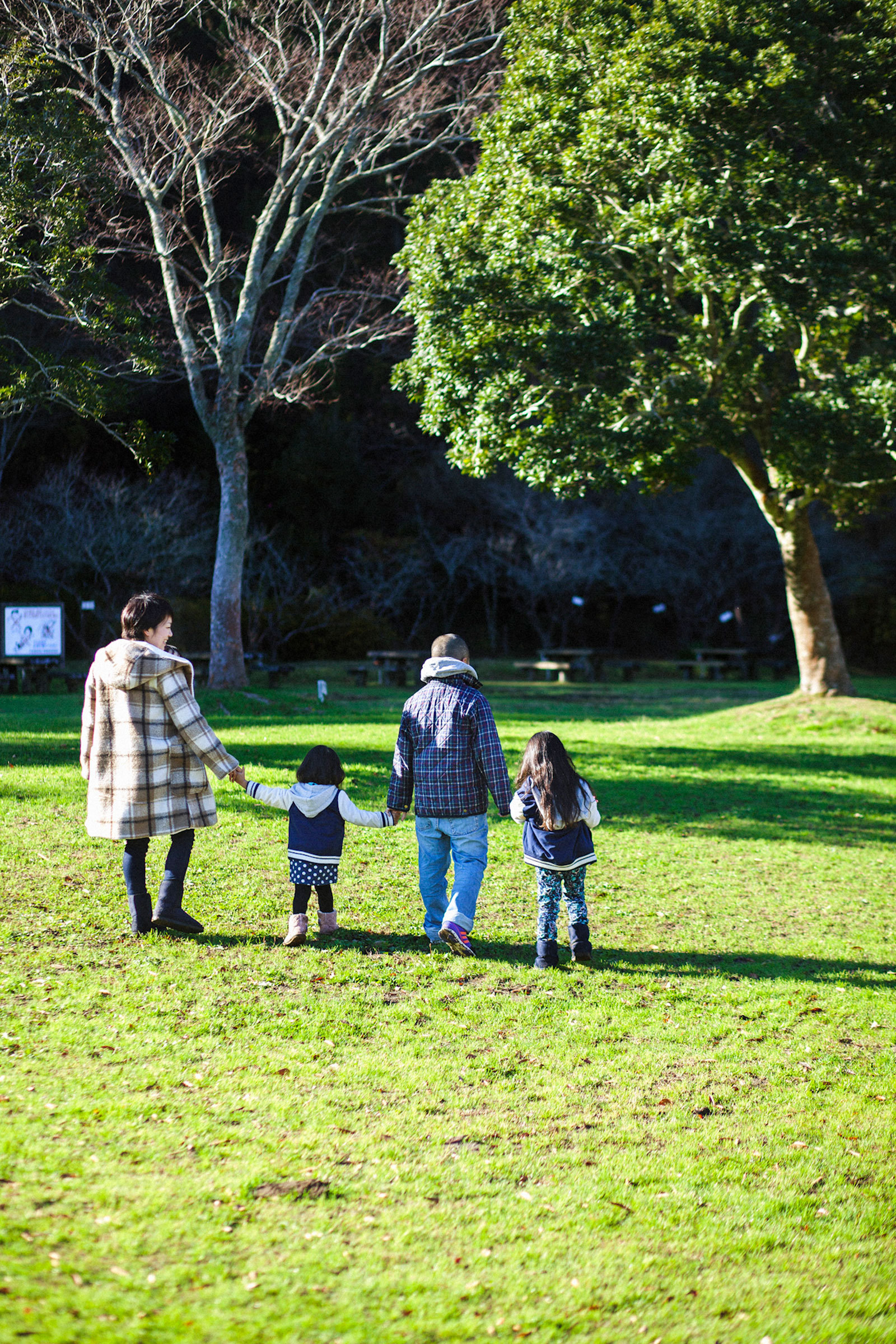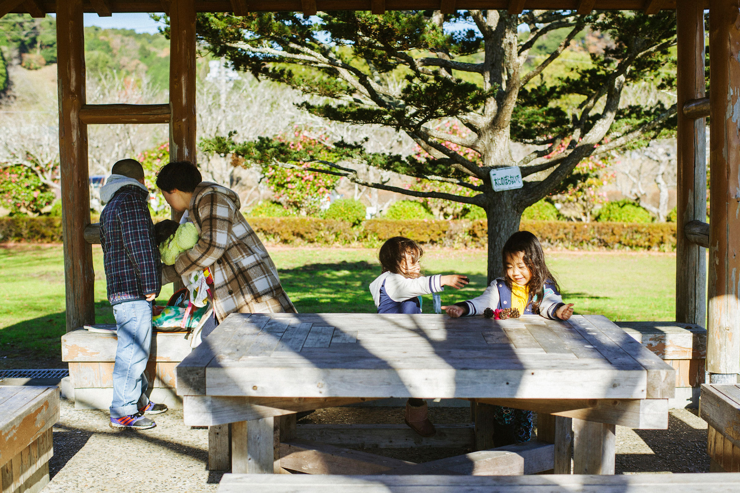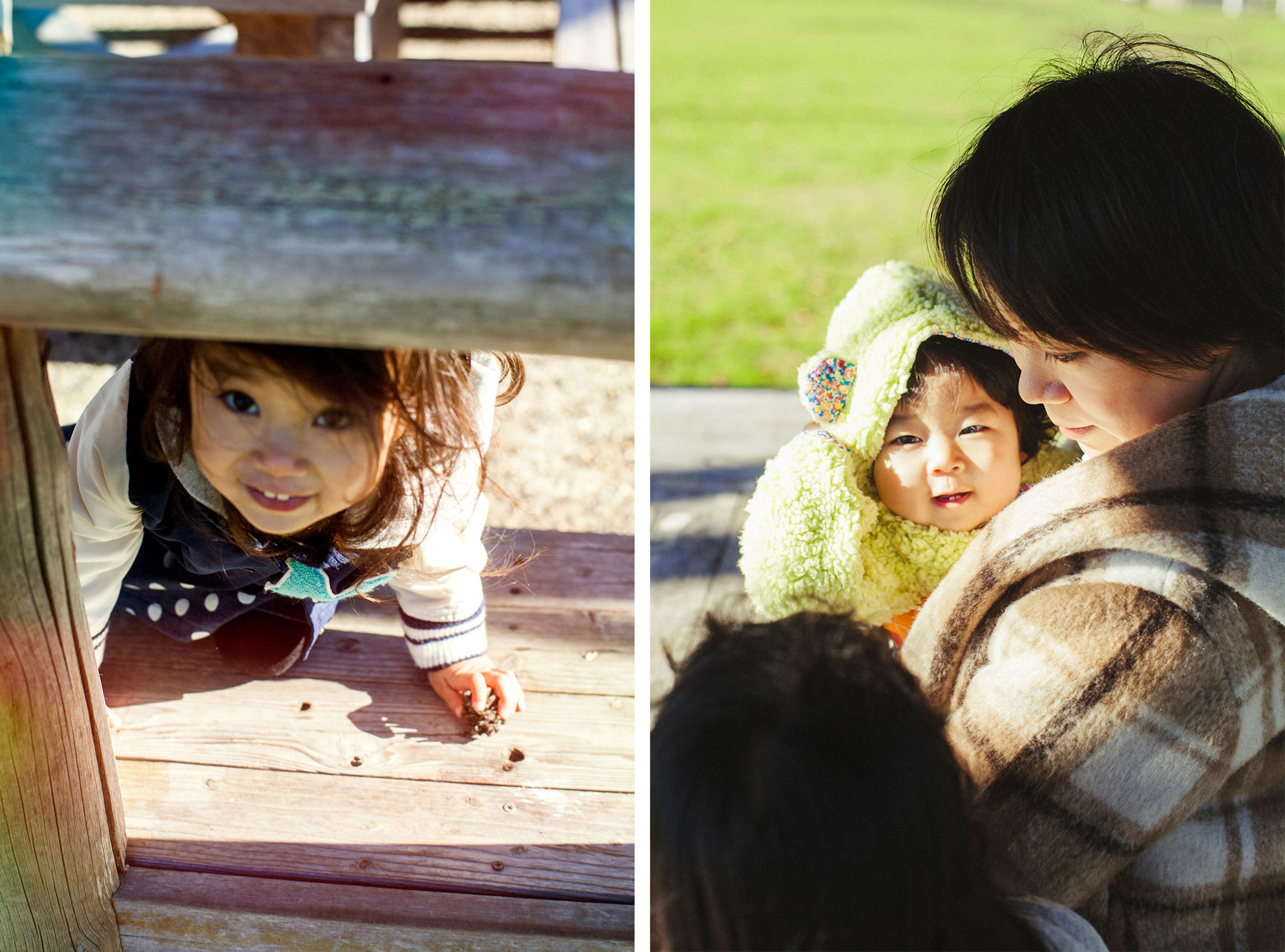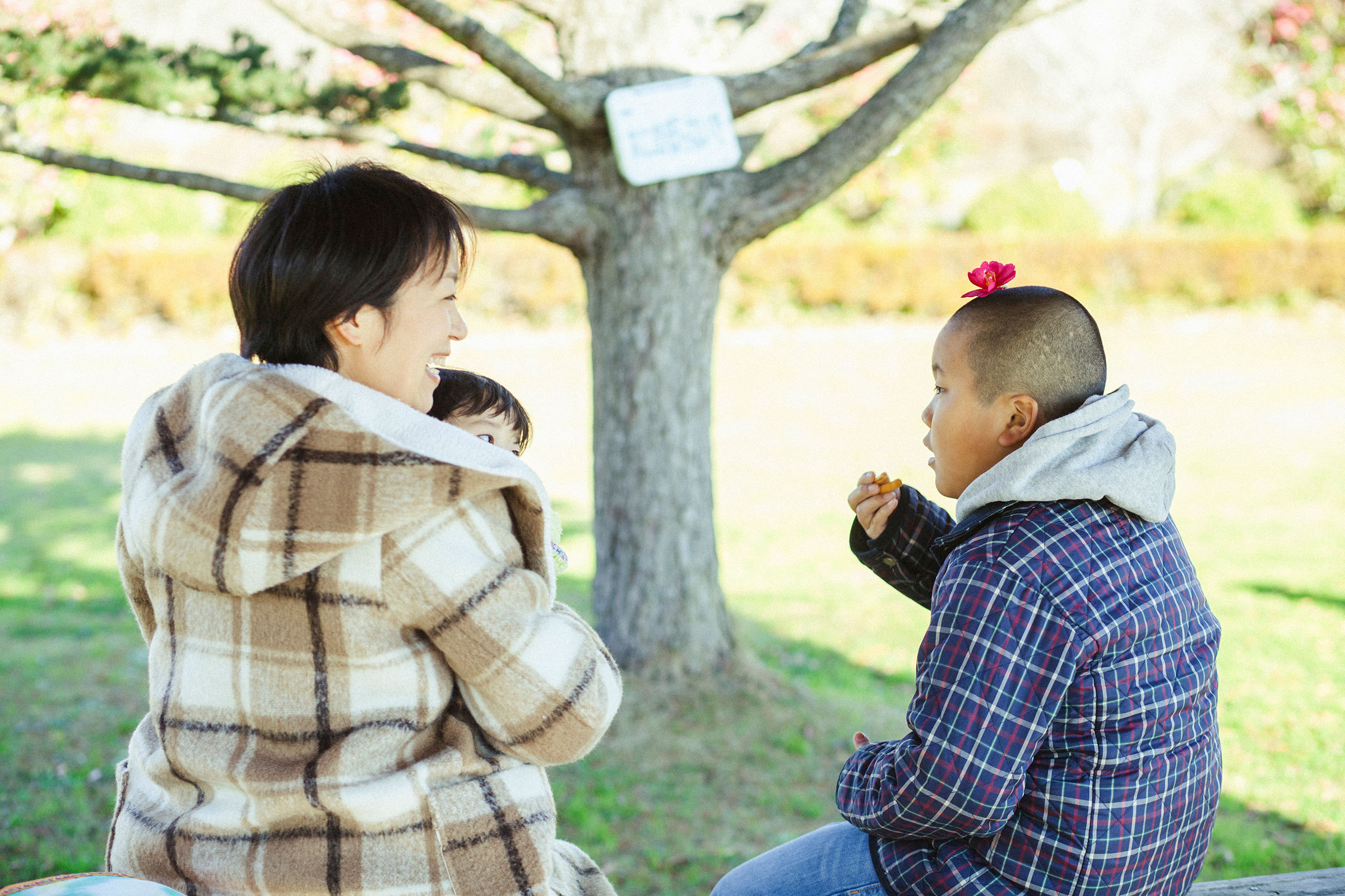 この日の撮影は「大多喜県民の森」。家族でよく遊びにくる場所だという。お兄ちゃんが妹たちの手を引き、お母さんが赤ちゃんを抱いて、4人並んで歩く。歩きながら落ちていた木の実を拾い、花を摘んで、それを見ながらおしゃべり。